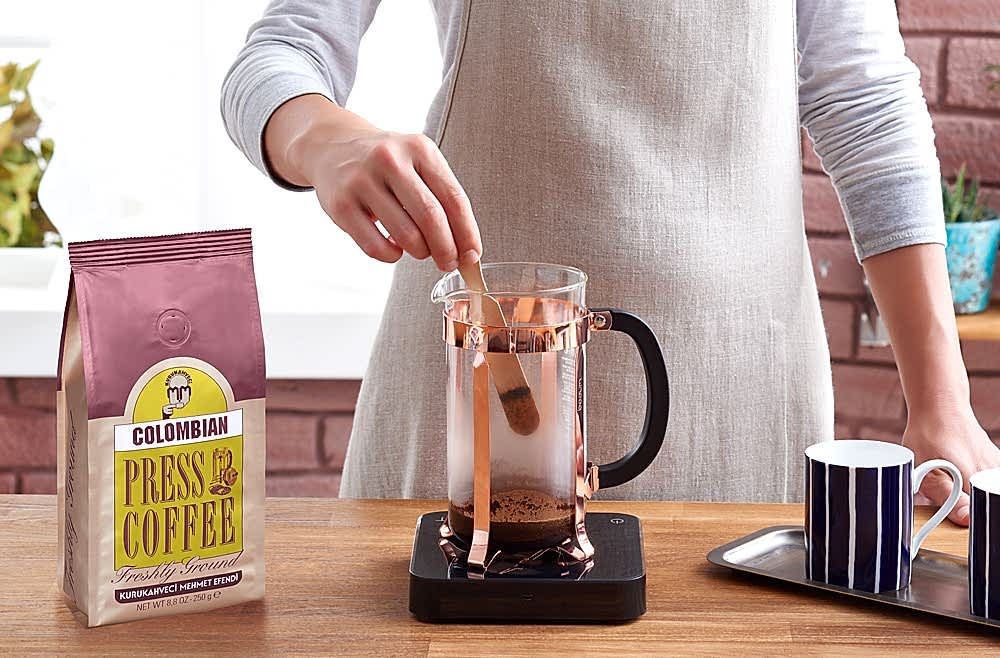 - 3)Bir çubuk kullanarak taneleri hafifçe karıştırın. Kahvenin 30 saniye boyunca suyla buluşmasını sağlayın.